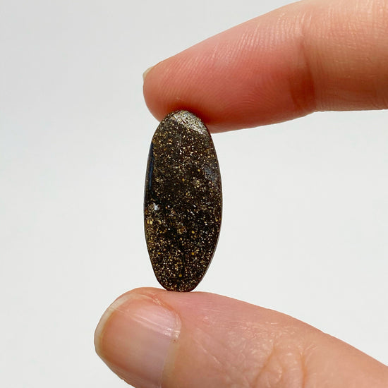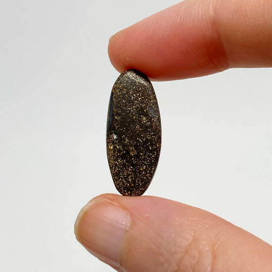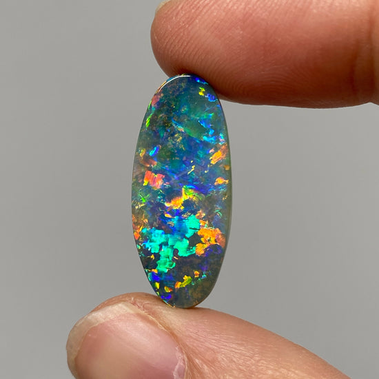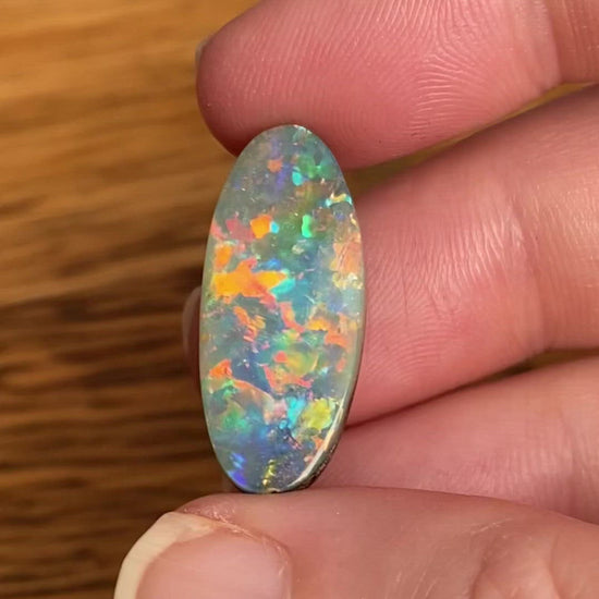 An oval boulder opal with brilliant, full spectrum, broad and rolling patchwork flashes. This is a very unique piece because some colours morph from one colour into another, while holding their shape.