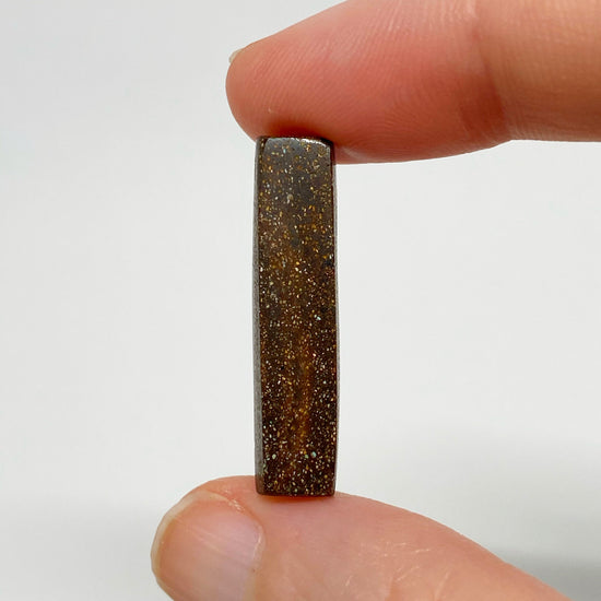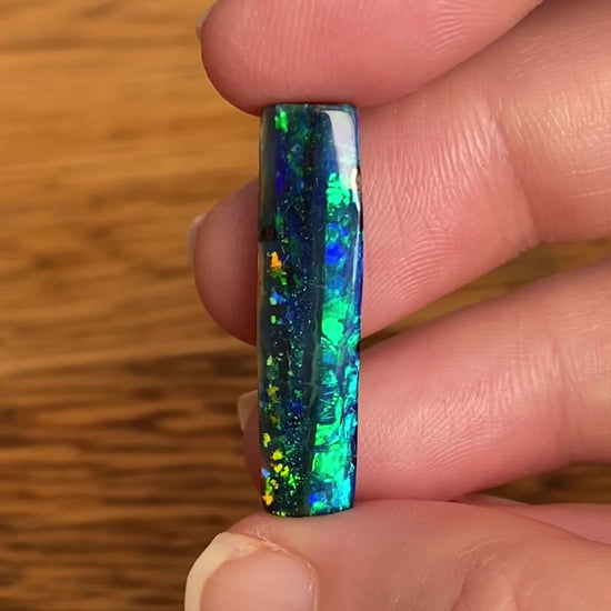 A long narrow rectangle boulder opal with brilliant greens and blues and a jet black body tone.