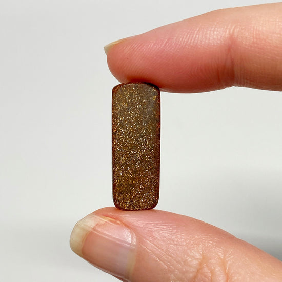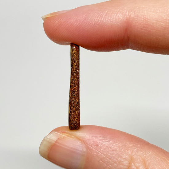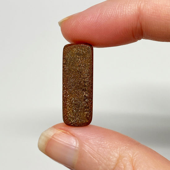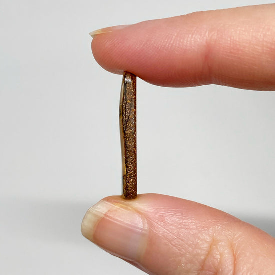 A fantastic rectangle boulder opal pair with rainbow colours on an interesting caramel-hued, lighter body tone / background. The pair is a total of 14.38 carats and they weigh 1.51 grams and 1.36 grams for the left and right, respectively.