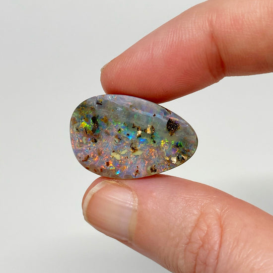 A pear-shaped boulder opal with pink, orange and green colors and a lighter body tone.