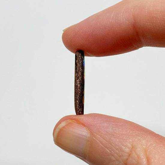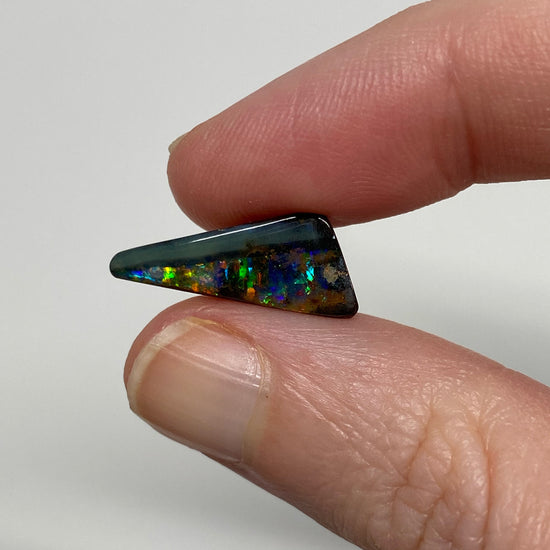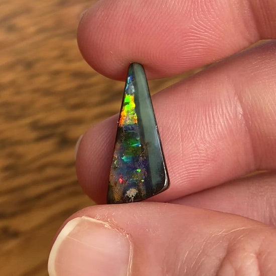 A small triangle boulder opal with a straw pattern and beautiful movement of colors. It also has a lovely black body tone.