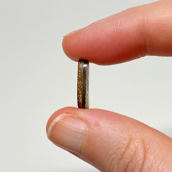 A small, free-form boulder opal with a combination of pinfire colors and a broad flash of pink-red, all on a light body tone.