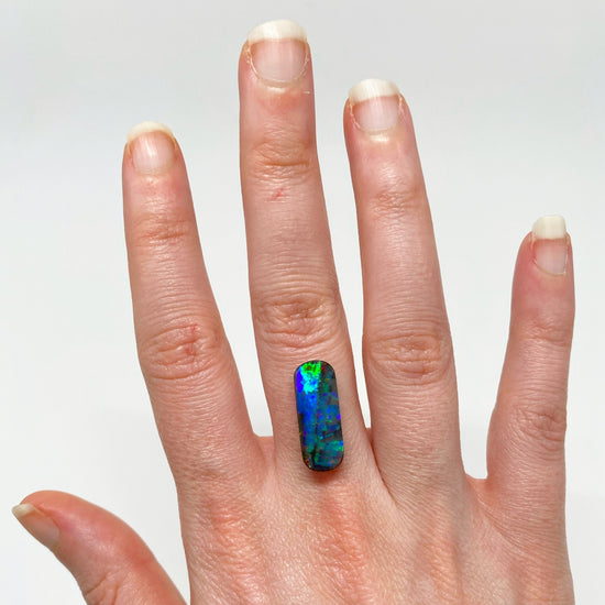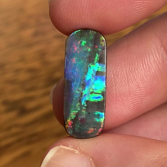 A small rectangle boulder opal with brilliant colors on a black body tone.