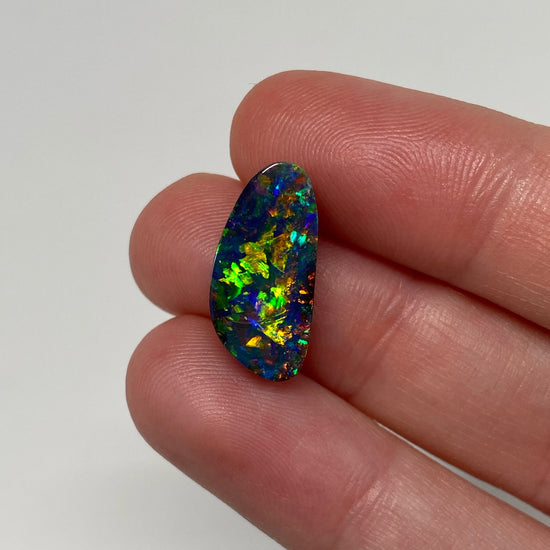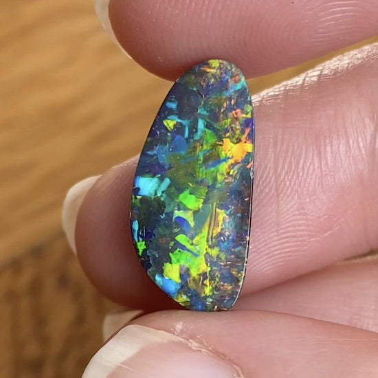 A stunning free-form boulder opal with brilliant colors and a black body tone.