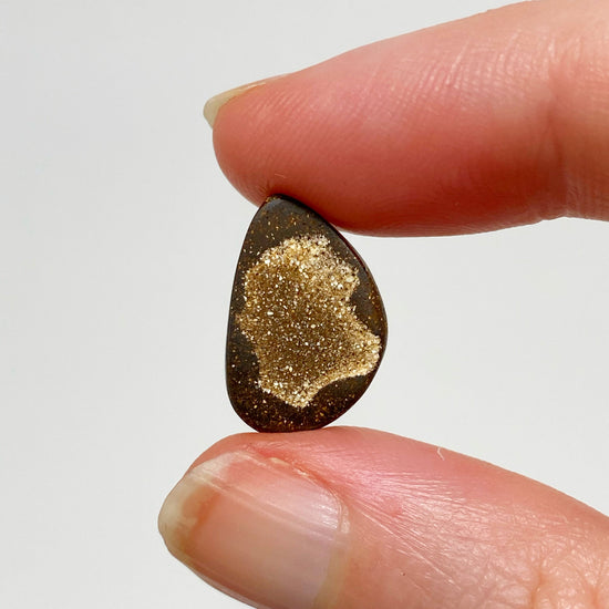 A beautiful free-form matrix boulder opal with brilliant colors on a dark body tone.