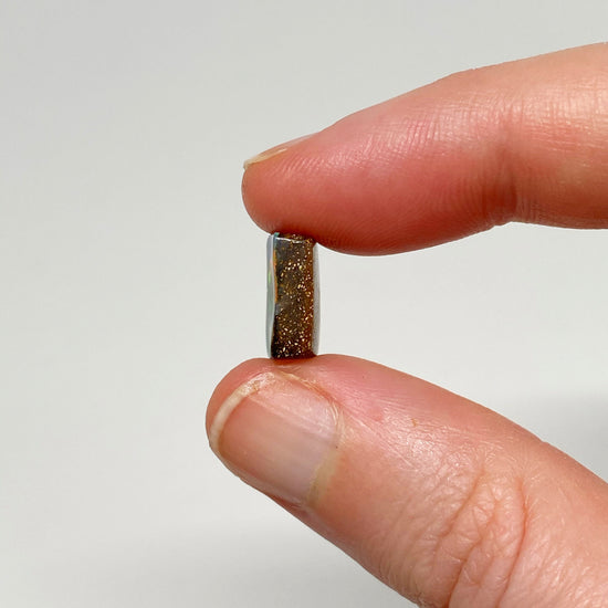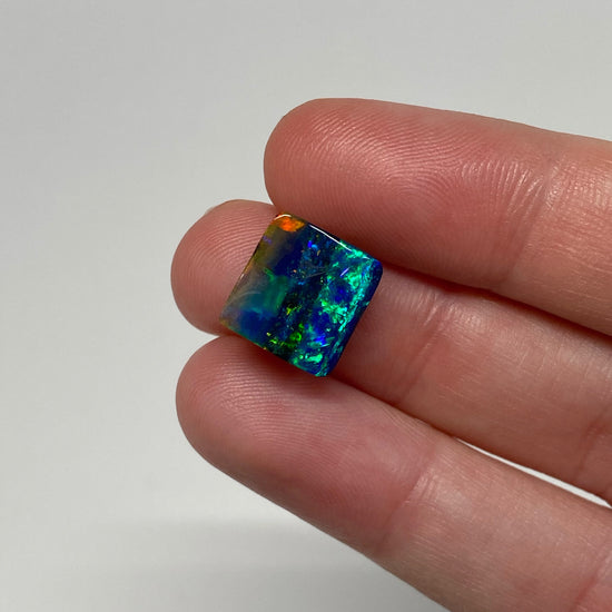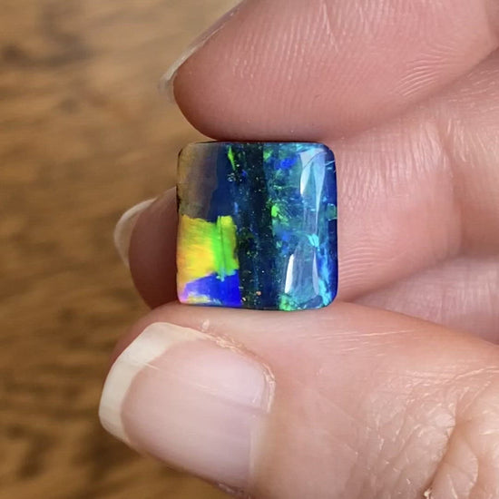 A stunning rectangle boulder opal with two different patterns and a black body tone.