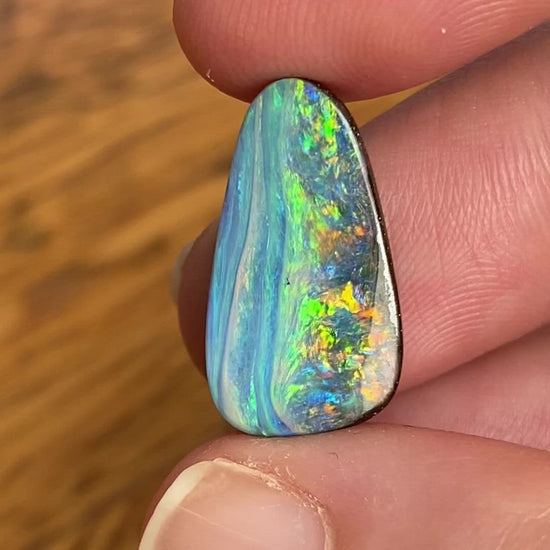A free-form boulder opal with ocean tones and orange and lime green flashes of color.