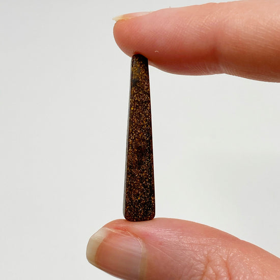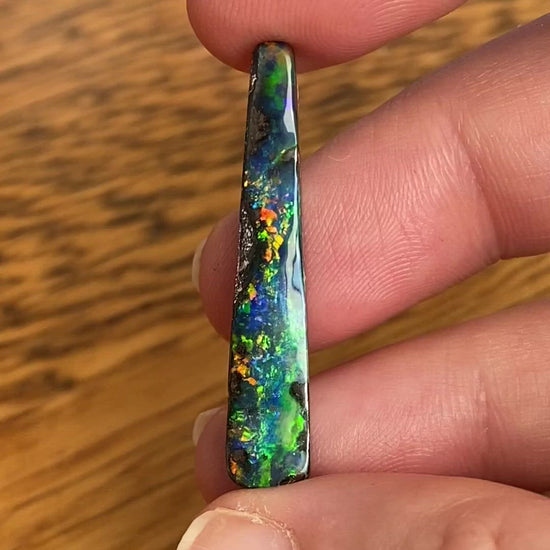 A long and narrow boulder opal with brilliant rainbow colors with a black body tone.