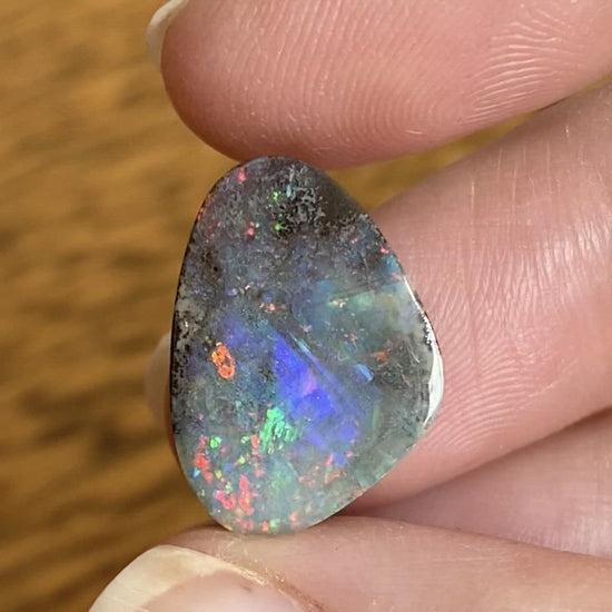 A very unusual boulder opal with broad flashes of pink-orange-red and greens.